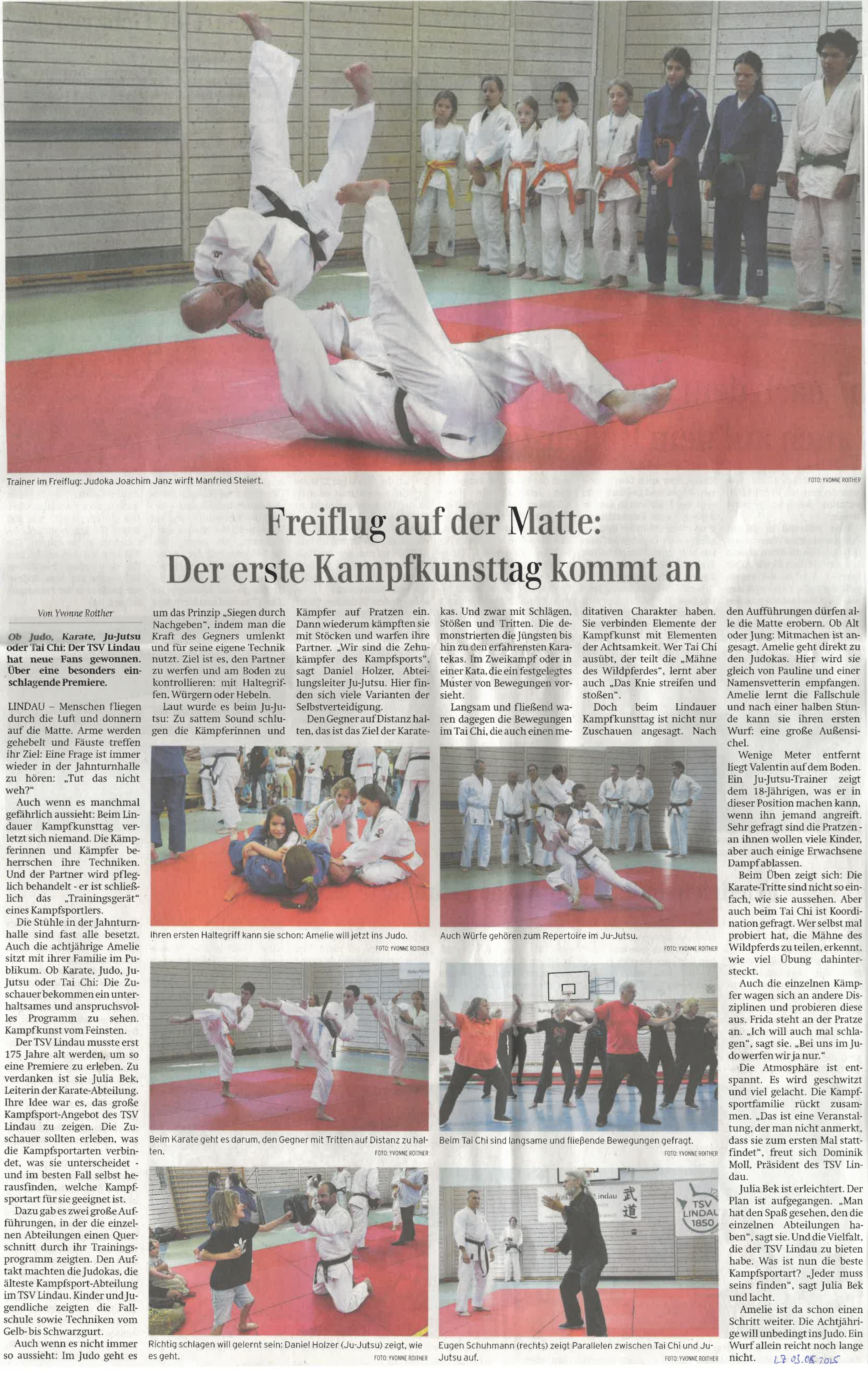 Zum 4. mal durfte die Karateabteilung des TSV Lindau 1805 e.V. Sensei (Lehrer) Manfred Zink, 8. Dan Kyusho-Jitsu, 5. Dan Karate und Sensei Jürgen Kestner, 7. Dan Karate, 5. Dan Kyusho-Jistsu zu einem Kampfkunst und SV Lehrgang in Lindau begrüßen. Zum Lehrgang kamen 20 Teilnehmer, darunter auch 6 Frauen. Neben der Karate und Ju Jutsu Abteilung des TSV waren auch Karatekas aus Friedrichshafen und Stockach anwesend. Manfred Zink, der Kyusho-Ausbilder und Autor verschiedener Fachbücher ist, und Jürgen Kestner, der auch hohe Graduierungen in verschiedenen Kampfkünsten hat und Ausbilder bei der Polizei ist, haben wie auch in den letzten Jahren den Lehrgang interessant, aufregend aber auch humorvoll gestaltet. Gezeigt wurden verschiedene Kyusho Techniken, die in den Karate Anwendungen enthalten sind. Bei dem intensiven Partnertraining in der Druck-, Schlag- und Hebeltechniken enthalten waren, sind die begeisterten Lehrgangsteilnehmer am Abend sichtlich erschöpft aber zufrieden nach Hause gegangen.